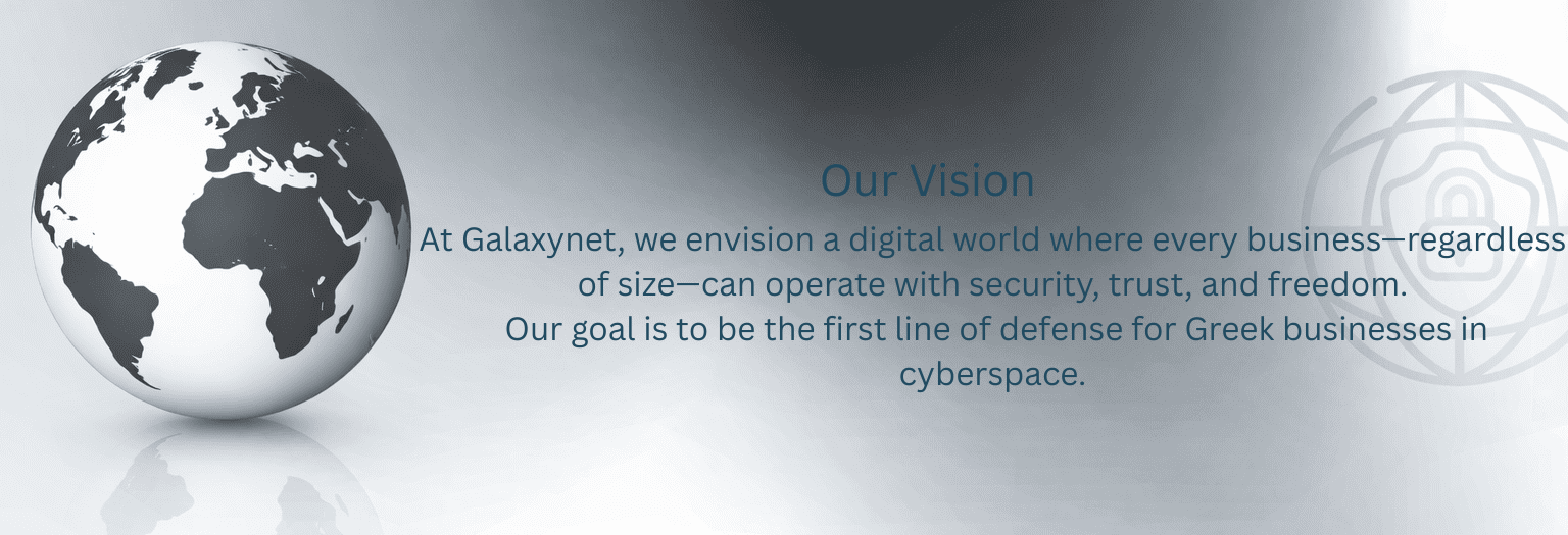 At Galaxynet, we envision a digital world where every business - regardless of size - can operate with security, trust and freedom. We want to be the first line of defence for Greek businesses in cyberspace. We believe that cybersecurity should not be a privilege, but a fundamental right of every professional.